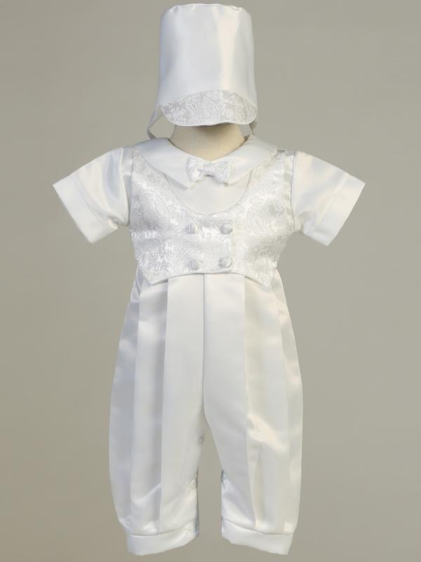 Satin long romper with jacquard vest.  Made in U.S.A.