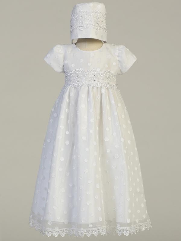 Embroidered polka-dot on tulle gown.  Made in U.S.A.
