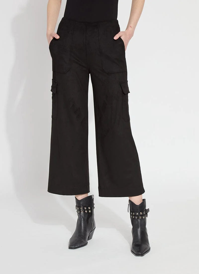 Made from 4-way stretch Vegan Suede, the Anita Hi Waist Vegan Crop Cargo combines luxe softness with utilitarian style. These suede cargo pants offer a wide, cropped leg, concealed patented waistband, front pockets, back yoke, and patch pockets placed below the hips for a slimming look. Pull them on with the Edena Smocked Sweater and black boots. Upon delivery, machine wash separately and hang dry.