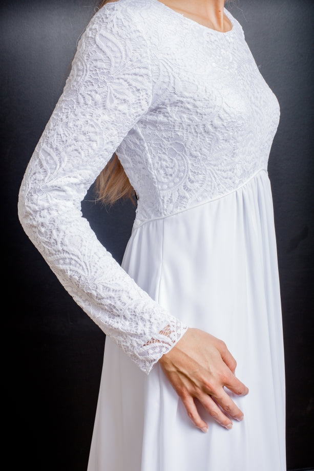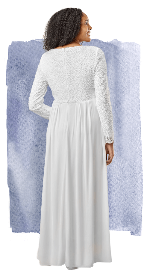 Soft, luxurious raised lace places this dress in the simply glorious category. All lace bodice front and back with sweeping skirt of soft doby fabric, fully lined with opaque denier makes this one of the most comfortable and flattering Temple dresses. Careful styling, sizing and the perfect details such as the piping at the empire waist, is the long awaited dress White Elegance customers have been looking forward to ordering. Be sure to view the back of dress with it’s elongated slimming look. Kudos to White Elegance Design Team!