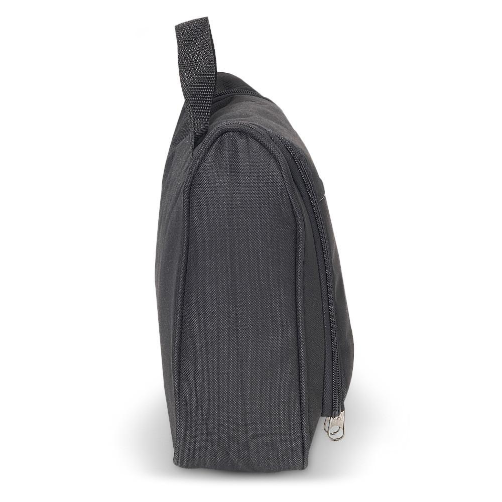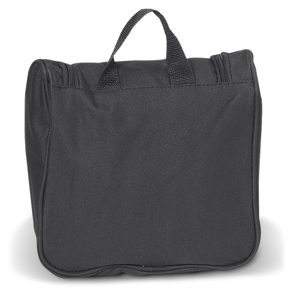 Features a hanger hook. Waterproof vinyl lining, and several compartmentalized pockets.